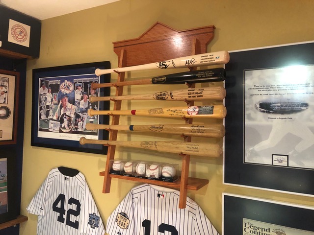A friend from the architectural firm where I worked for forty years is a huge New York Yankees fan, and actually designed the facility where the Yankees conduct spring training in Florida. He has an extensive collection of baseball memorabilia and asked if I could make two racks to display part of his bat collection. He suggested the basic configuration and provided the bronze head plate. Rift sawn red oak stained with cherry was used for the racks