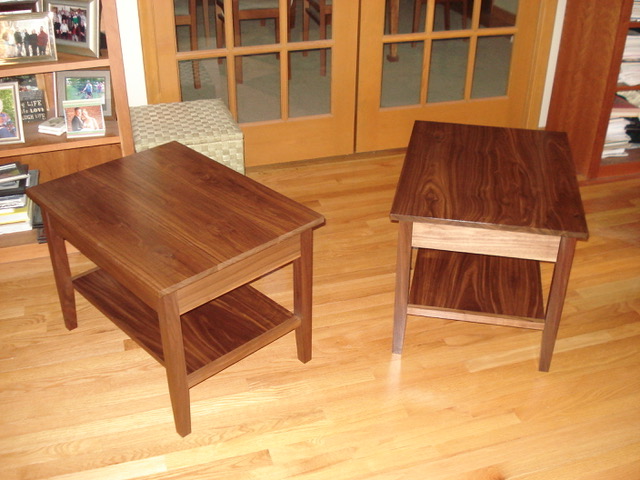 These tables were made for the same friend who requested the cherry dining room table and chairs. They both incorporate concealed drawers made from aspen and joined with hand cut, half-blind dovetail joints. The lower shelves use breadbox ends for support in order to allow for inevitable wood movement.