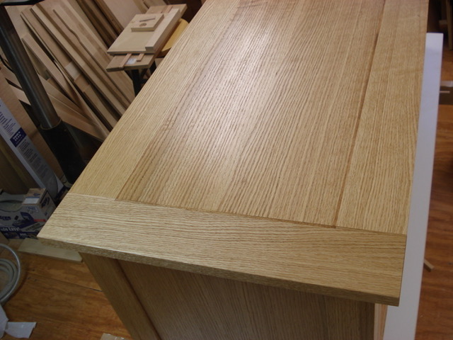 This piece was made for my daughter and her husband to support their TV and various electronic components. It is made from rift sawn red oak with mahogany accent strips on the top. The top is fabricated using bread board ends to allow for wood movement.