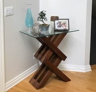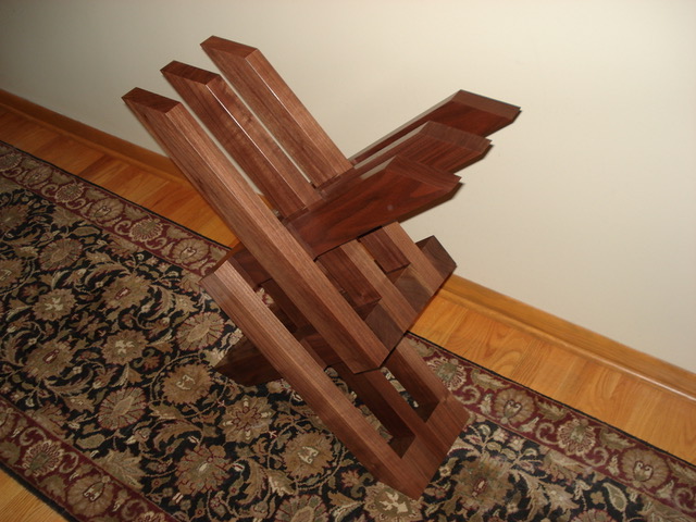 This is the vertical version of the entry table without horizontal or vertical support members. It was requested from one of the interior designers who worked at the architectural/engineering firm where I worked for 40 years, and was constructed using 8/4 walnut. The glass top was provided by the owner.