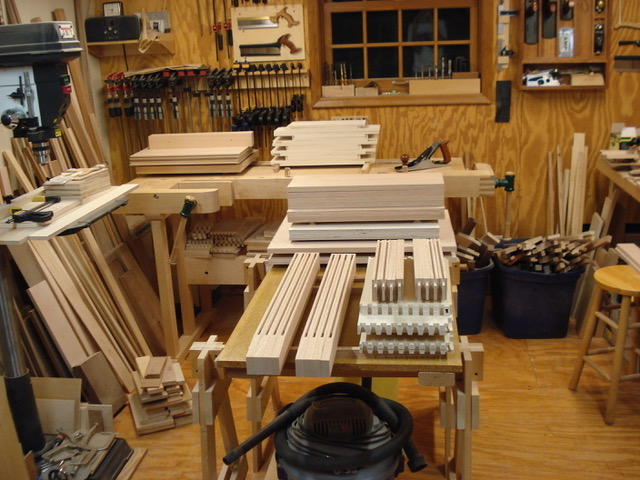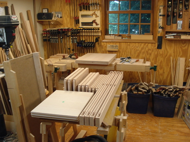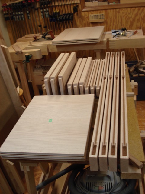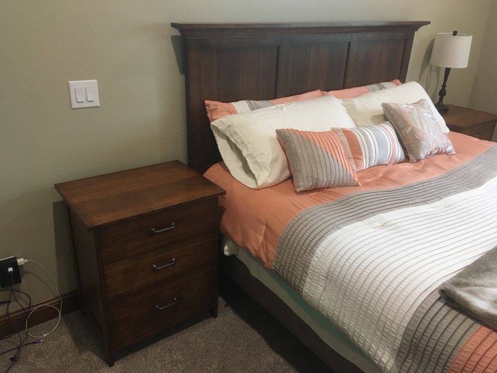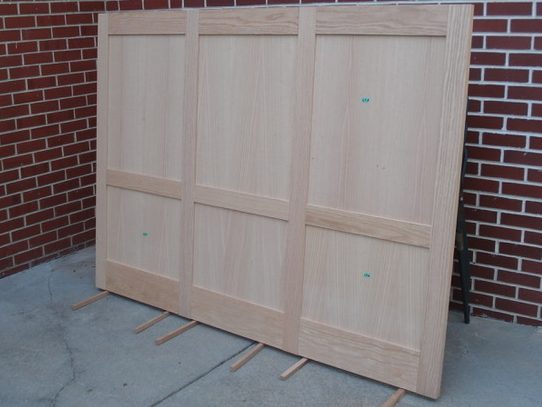 My sister-in-law suggested to a work friend of hers who had just moved into a new house outside of Des Moines that her brother-in-law might be interested in making a head board and night stands for their new bedroom. The new house used dark stained red oak for the woodwork and cabinetry so it was agreed to match this wood. The headboard was made from 5/4 oak with plywood panels so it is quite heavy. Images below show progress photos prior to assembly. Finished installation photos are pending.