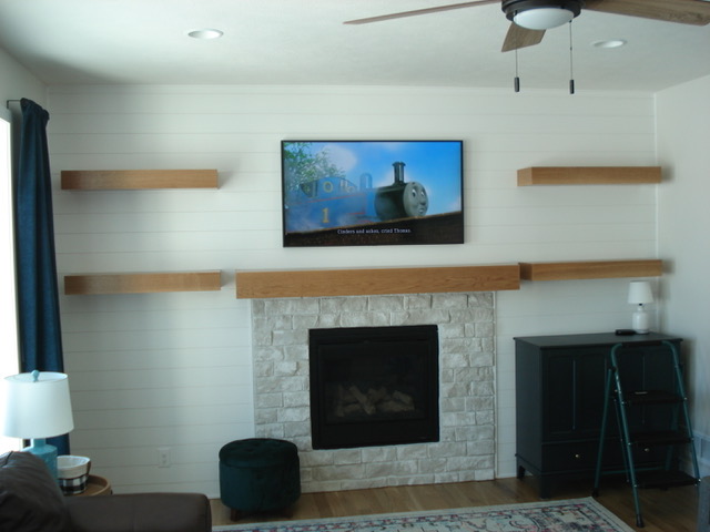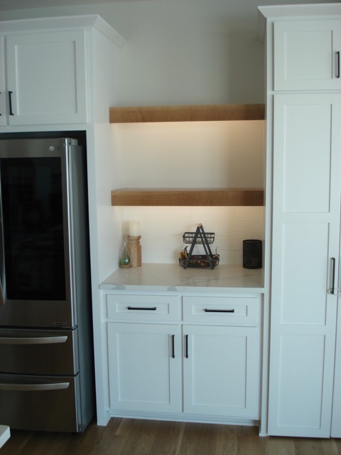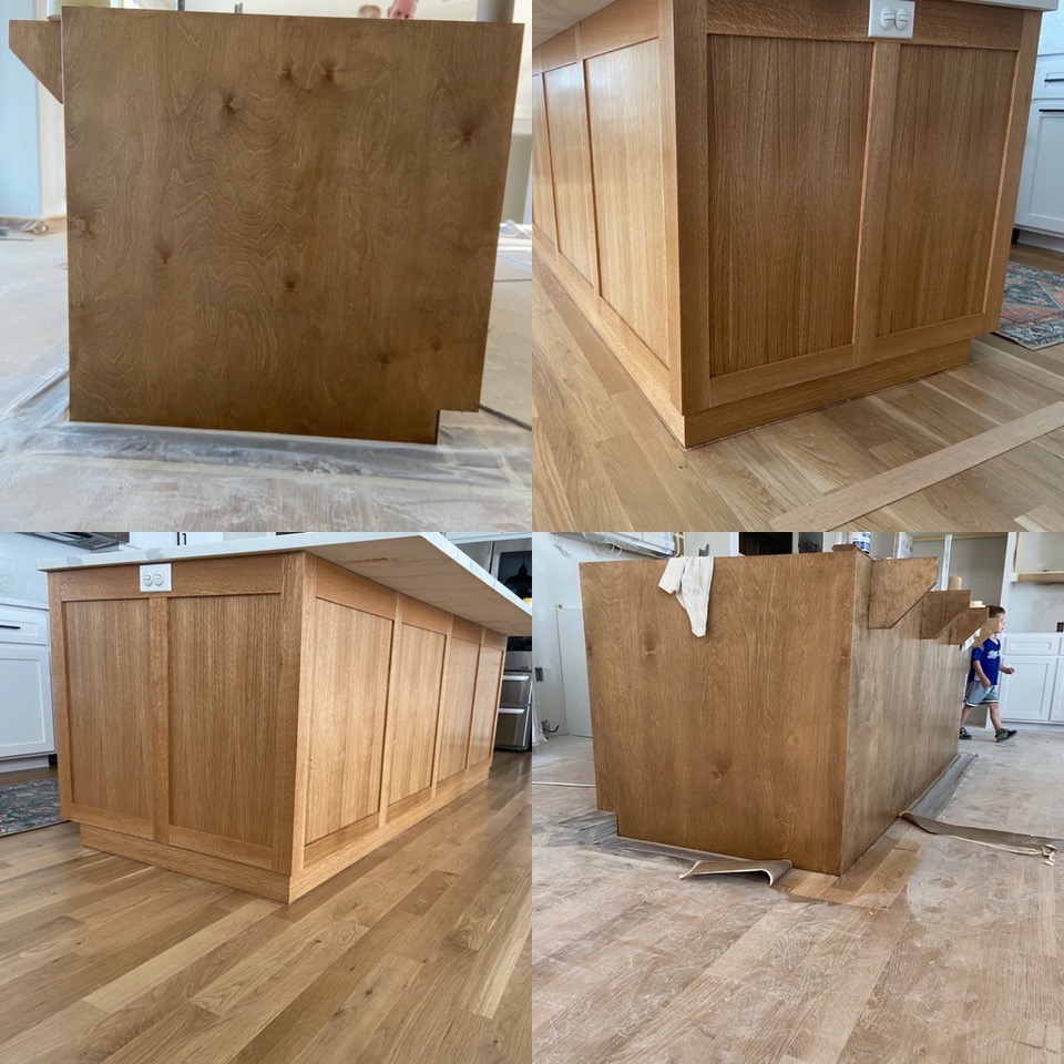 Upon moving into her new house my niece was unhappy with the appearance of the island and shelves in her new kitchen. The builder had made the island and shelves from rotary cut ash and applied a dark stain as shown in the first photograph. She asked if I could do anything to improve the appearance. Given the wild stain of the plywood I suggested that we simply reface the stained wood and create a frame and panel theme using white oak to match her floors. The second photo shows the final product after refacing. Similar recoverings were made for shelves and the fireplace mantel.