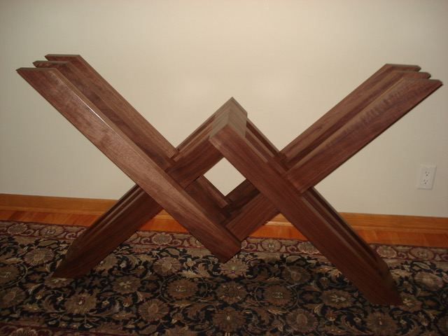 An interior designer who worked at the architectural/engineering firm where I worked sent me a photograph of an unique table base that was supported without using any horizontal or vertical members. She asked if I could make a base from walnut for which she would provide a tempered glass top. I made a half-size mock-up in pine to verify the approach that I planned for using 1/2″ dowels to hold the various elements together. Due to the complexity of applying a urethane finish I applied a six coats of a wipe on urethane finish to avoid runs. Photographs below show some progress shots taken during fabrication and assembly.