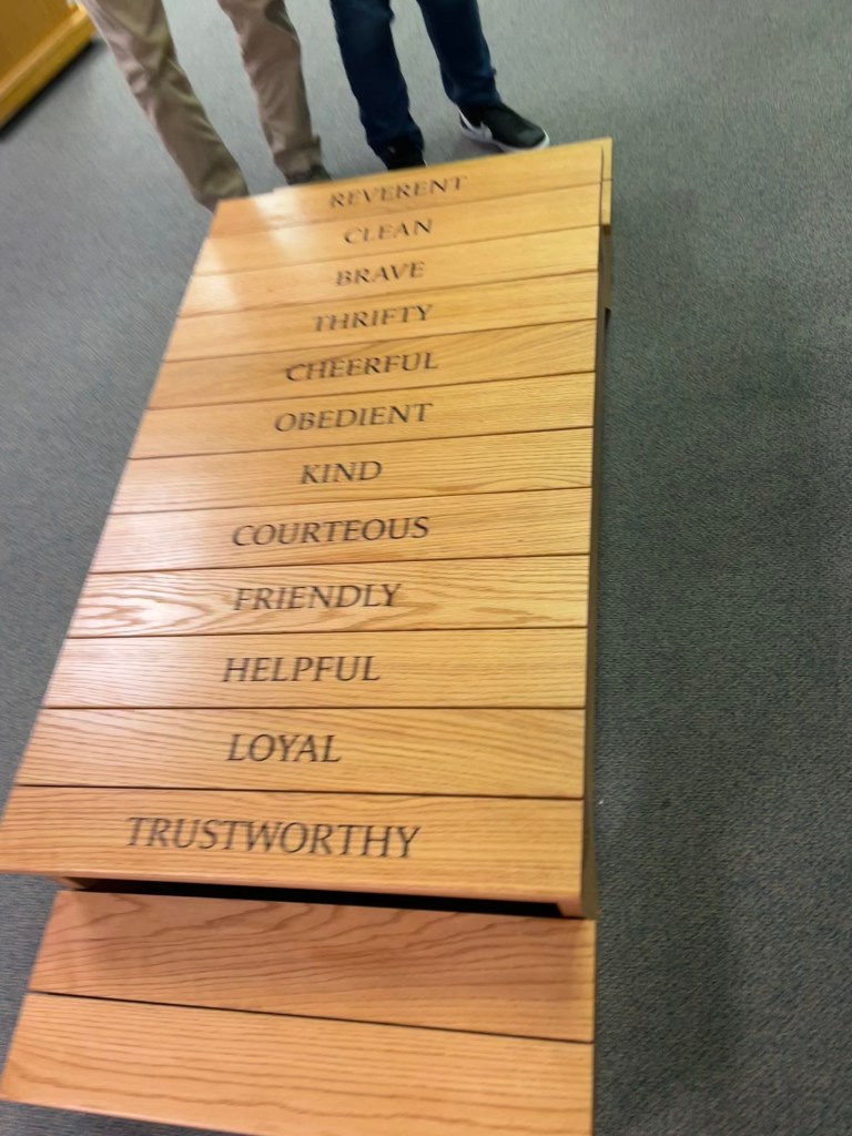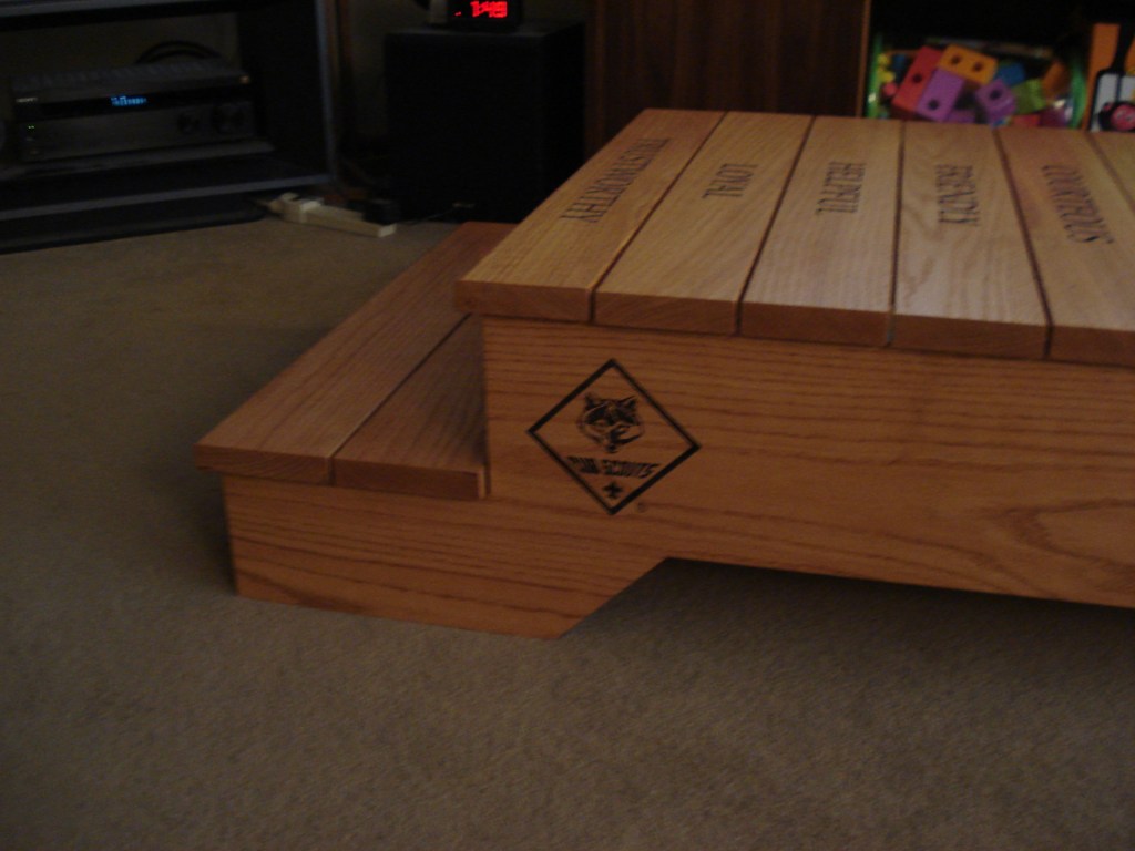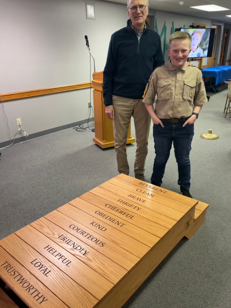 My grandson reached the stage of “crossing over” from cub scout to boy scout status and his father, my son-in-law, suggested that he and I build a bridge symbolizing this process. It incorporates the twelve points of the scout law, and includes the cub scout logo on the starting side with the boy scout logo at the end of the bridge. The structure is assembled with dowels so that it can be disassembled and stored for use by the cub scout pack in their annual ceremony.