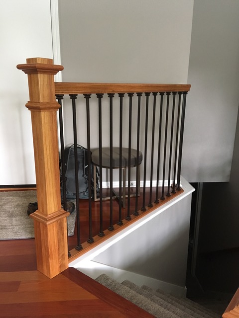 A church friend had recently remodeled their home, using Jatoba for the flooring. The original home had oak balusters and railing for the basement stair, and it was incompatible with the new environment. They asked if I could remove the original railings and replace it with new. Similar to domestic cherry, Jatoba is light sensitive and darkens with exposure to light. Over time the wood elements darken to match the floor.