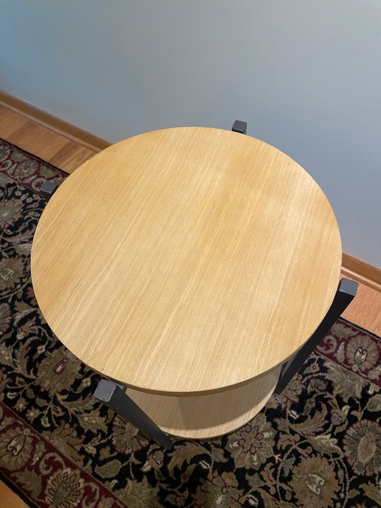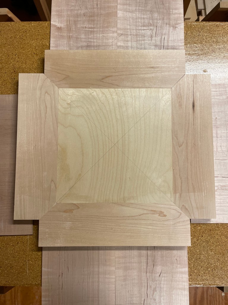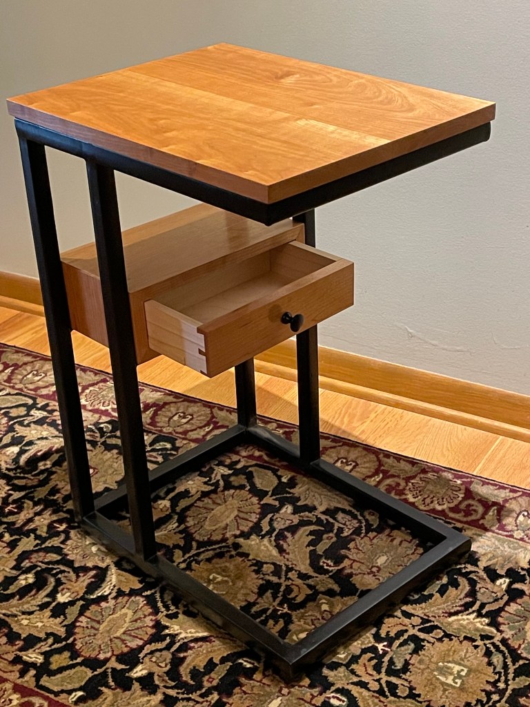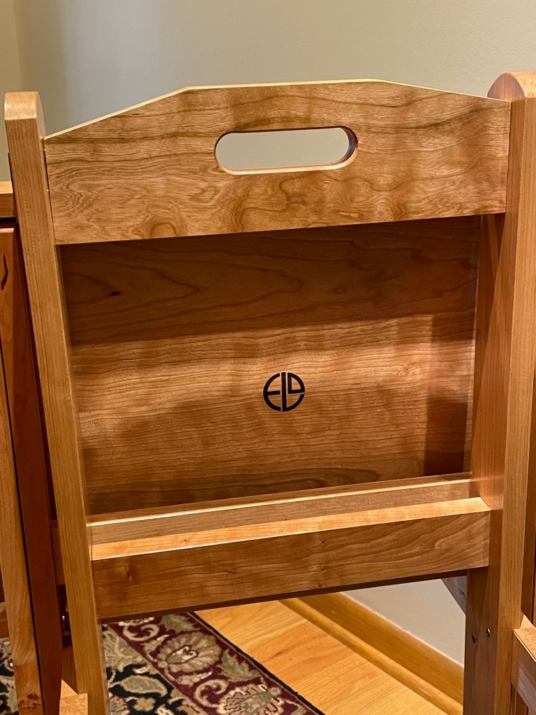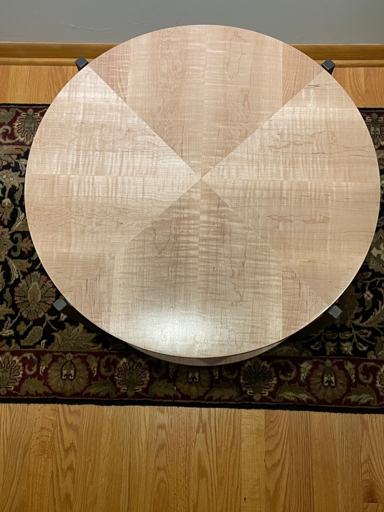 My sister asked if I could make new table tops for tables that she had purchased but whose tops were made cheaply from wood of unknown species. She also asked if I could make new TV trays and stand to replace ones that had been in service for too many years. She asked if they could be engraved with text that was meaningful to her family. The new tops were made from curly maple cut to be book matched and forming a quadrant pattern. Existing photos show the original grain.