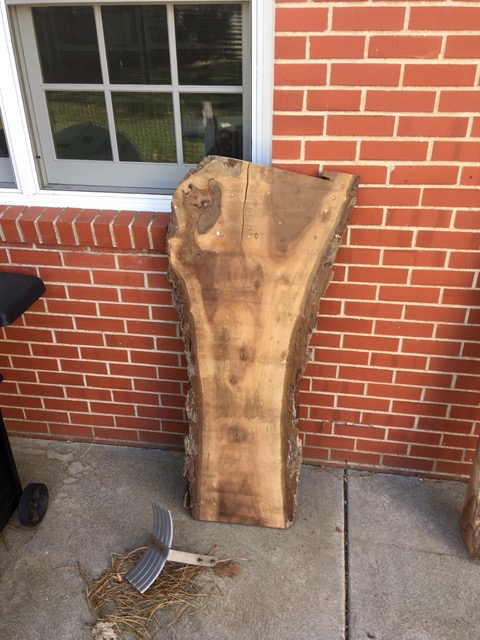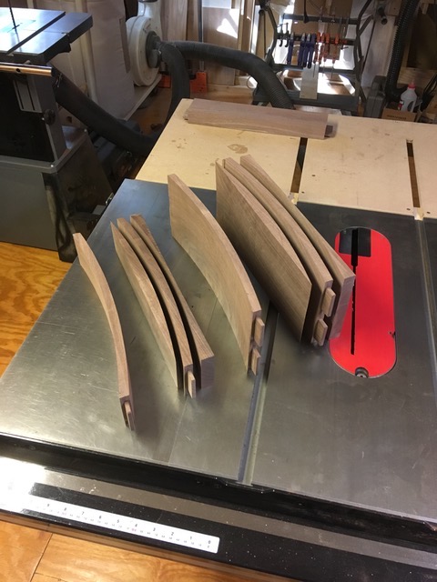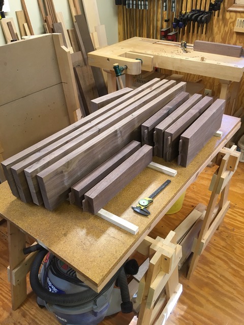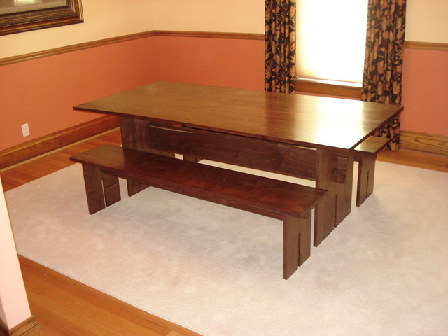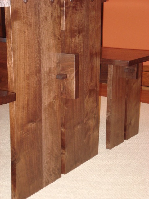 This project was requested by an architect friend who worked at the architectural/engineering firm where I worked. She and her husband lived on an acreage near Elmwood, NE, where they had to cut down an old walnut tree on their property. They asked me if I would design and fabricate a trestle table and benches for their three sons. They took the log to a nearby sawmill and had it cut to my dimensional suggestions. The table and benches can be disassembled into flat pieces, and they can be assembled and secured using a series of walnut wedges. After the original benches were made they asked if I would make two chairs from the same stock of walnut. The photographs below show the original raw wood prior to fabrication and some progress shots.